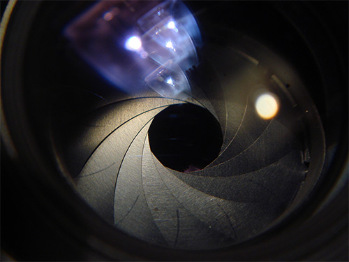 This enables the size of the hole to change. When the hole is larger, more light passes onto the sensor, and vice versa. Somewhat confusingly, a large aperture has a number like f/2.8 and a small aperture has a number like f/22.